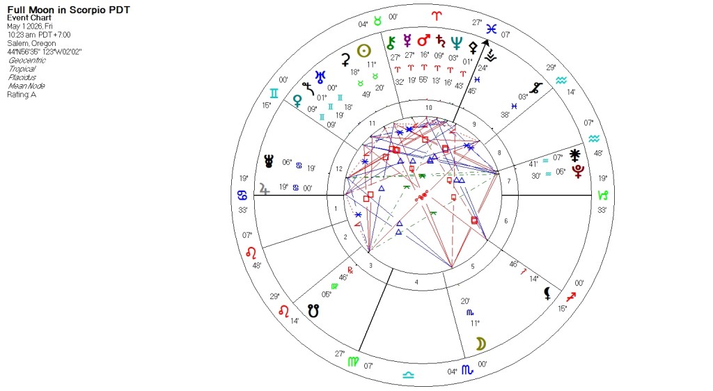This upcoming Full Moon lands in Scorpio on May 1st, so expect emotions with extra horsepower. Scorpio doesn’t do “mild.” It does deep truths, hidden motives, intense realizations, and eye contact that lasts too long. Technically, the Sun at 11° Taurus opposes the Moon at 11° Scorpio, creating the classic Full Moon tension between comfort and transformation. In plain English: one side wants snacks and stability, the other wants emotional rebirth by midnight.